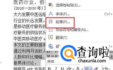 然后选中要设置的段落,单击鼠标右键,选择段落。