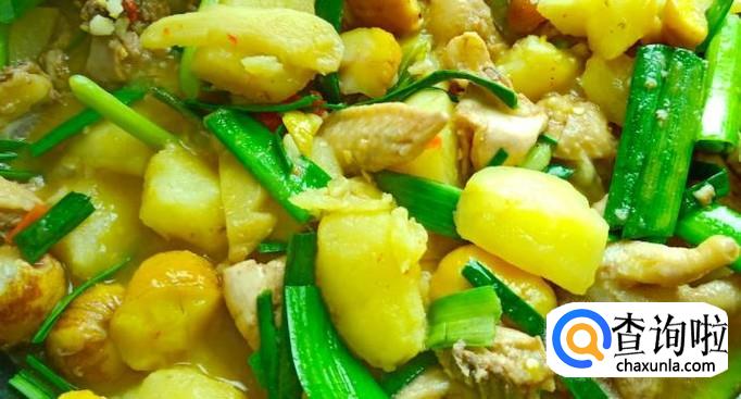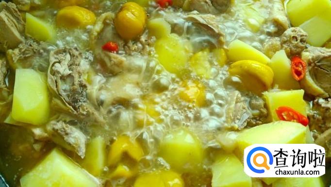 待鸡肉水汽炒干后放入适量白酒烧去腥味。随后,锅中加入酱油、醋、以及一听啤酒,随后下入板栗、土豆一起煮。