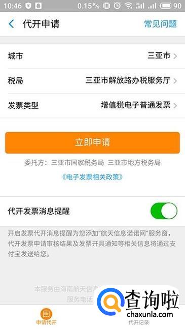 如果想要使用“发票代开”功能的话,先要进行城市和服务商的申请。