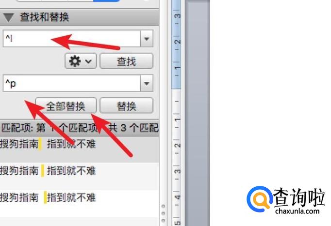 在替换窗口里,第一个输入框输入‘^l’,第二个输入框输入‘^p’,这二个字符就是分别对应软回车和硬回车的。点击‘全部替换’按钮。