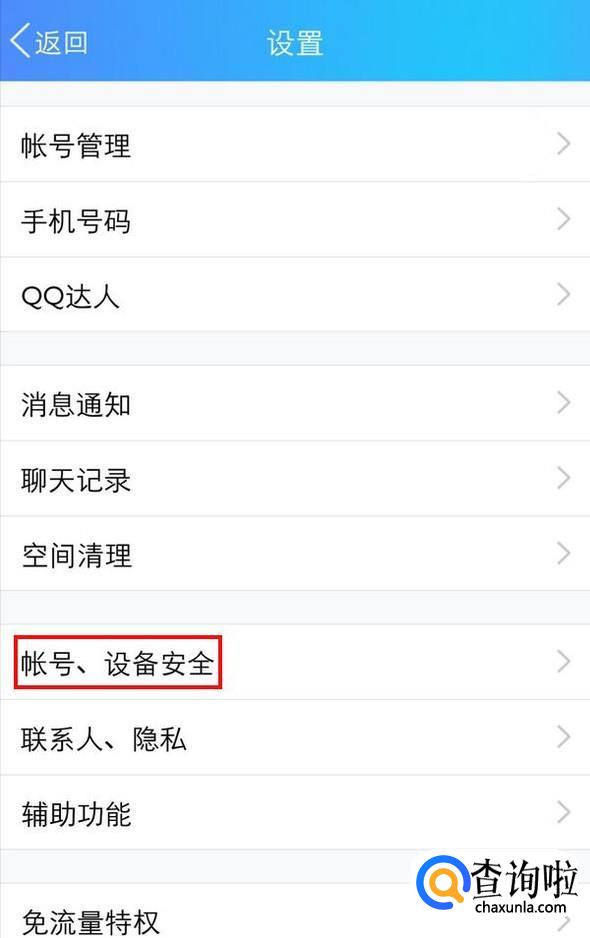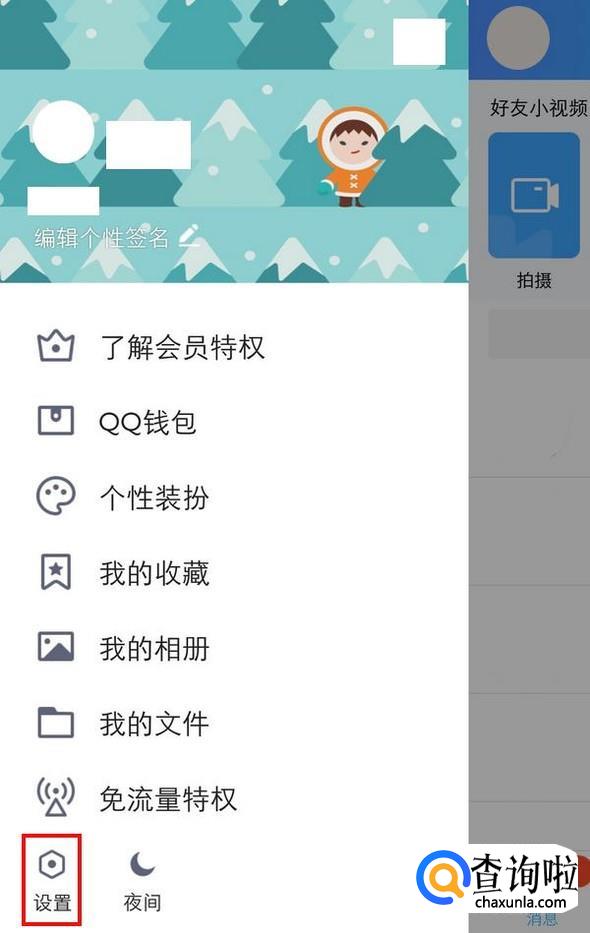当然QQ自身也是可以查看登录情况的,进入QQ,从左边缘向右滑,滑出菜单界面,点击“设置”,找到“账号、设备安全”,进入;