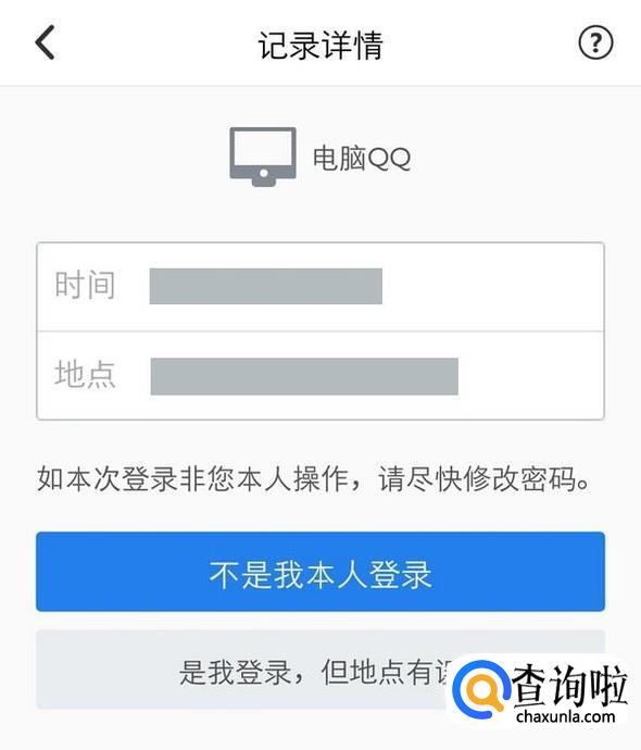 每一条记录都是可以查看详情的,时间具体到分,地点具体到城市及其对应的IP,下面的两个按钮,一个用于保护,一个用于纠错;