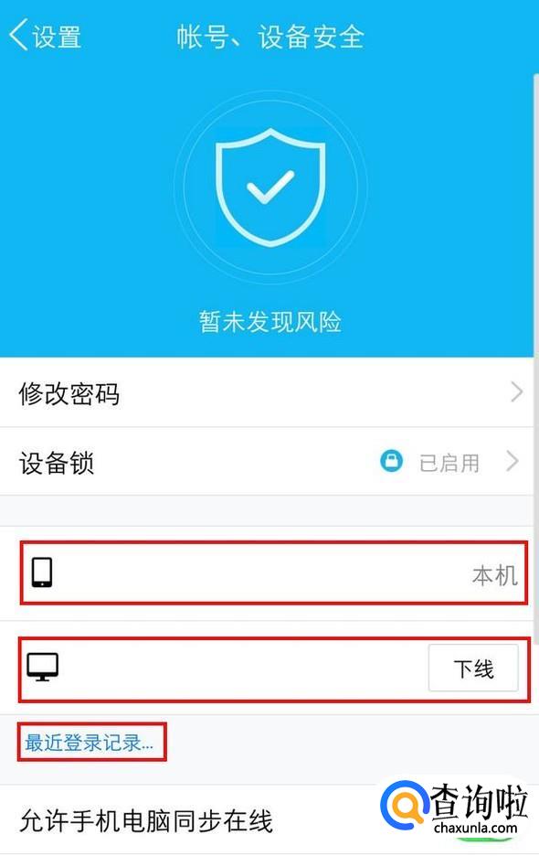 这里显示有正在登陆QQ的手机及电脑,点击下面的“最近登录记录”,里面也有和QQ安全中心类似的记录;