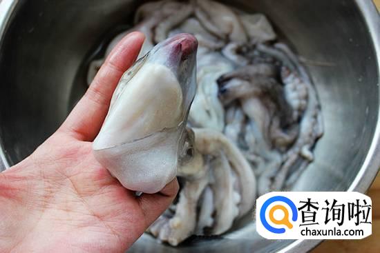 然后再去章鱼的皮,从头部顺着往下撕即可。最后把章鱼再冲洗一下,洗过的水清澈就代表清理干净。