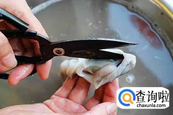 搓洗干净后,使用剪刀把八爪鱼的头部剪开,找出章鱼的牙齿,抠掉。把八爪鱼的内脏全部挤出来,并把墨汁清洗干净。清除出来的章鱼的内脏,统统扔掉。