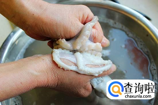 冲洗完以后,水里加入适量醋和碱面,再放进章鱼,用手不停搓洗,至章鱼表面的粘液被清洗干净。