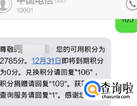 除了通过电信网上营业厅查询自己的电信积分,还可以通过短信的方式查询电信积分,打开手机输入105到10001就可以查询自己现有的电信积分啦。