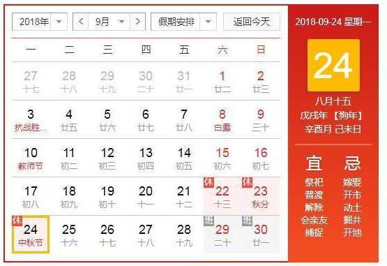 2018中秋节放假时间安排:2018年9月22日~2018年9月24日,9月24日(周一)补休;共3天