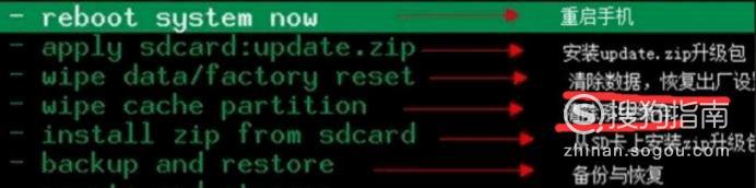 进入恢复模式后,我们用音量加减选择选项,注意图中标红选项,分别是清除所有数据、恢复出厂设置以及清除缓存。