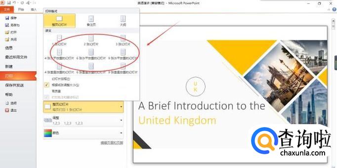 在打印界面中出现打印设置,我们就是在这里设置幻灯片打印张数。