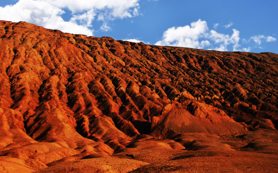火焰山古称赤石山,位于吐鲁番盆地的中北部,古丝绸之路北道。呈东西走向。火焰山,维吾尔语称“克孜勒塔格”,意为“红山”,唐人以其炎热曾名为“火山”。 山长100多公里,最宽处达10公里,海拔500米左右,主峰海拔831.7米。