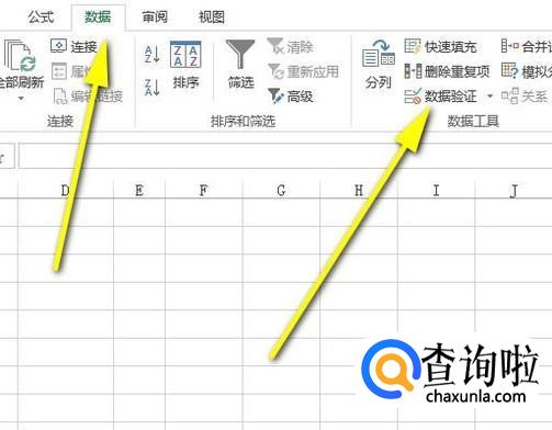 然后,在菜单栏中,点“数据”选项卡。再在下面的“数据工具”组这里点击“数据验证”。