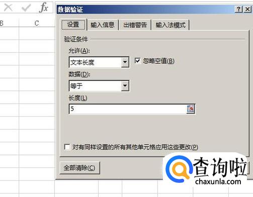 弹出数据验证的设置面板。在这面板中,我们就能看到这里已设置了一个限制,输入的数值文本长度等于5个字符。也就是说,输入数值不够5位或是多于5位都会显示非法。