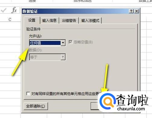 鼠标点击“允许”下拉按钮,弹出的下拉菜单中点“任何值”,再点确定。这时,我们再输入数值时,不会出现非法的警告语了。