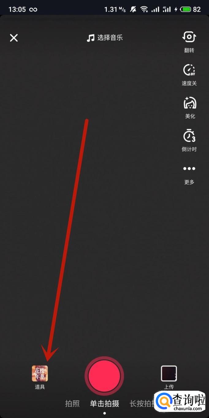 抖音玩特效需要点击“+”,点击“道具”,打开道具菜单栏,选择想要使用的特效,返回到拍摄页面,点击“单击拍摄”,点击图示位置的“对勾”,点击“下一步”,进入发布页面,编辑好发布内容,点击“发布”即可