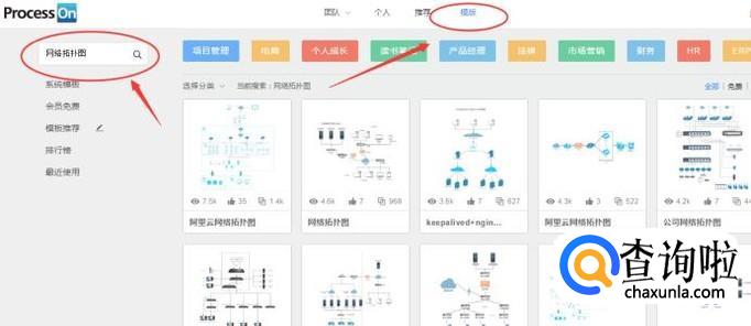 切换到【模板】选线卡,然后搜索【网络拓扑图】,如下图所示: