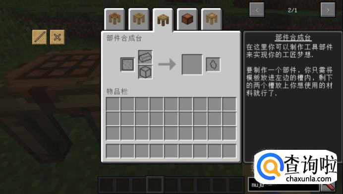 接下来再在上面便签页找到部件加工台,打开这样的一个界面。点击左侧模具,然后在中间格子里面塞入材料即可制作部件。