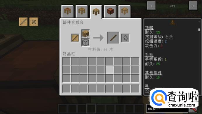 现在就可以往里面塞入一些原材料来制作部件了。不过目前能做的只有木头、石头、燧石、仙人掌、骨头之类的柔软材料的部件,我们这里放入橡木做个示范。