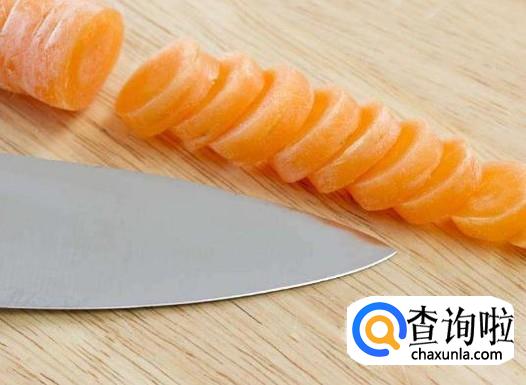 用刀把胡萝卜切成均匀的块。这样便于打汁时,打得更碎。
