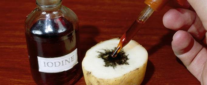 直链淀粉遇碘呈蓝色,支链淀粉遇碘呈紫红色,糊精遇碘呈蓝紫、紫、橙等颜色。这些显色反应的灵敏度很高,可以用作鉴别淀粉的定量和定性的方法,也可以用它来分析碘的含量。
