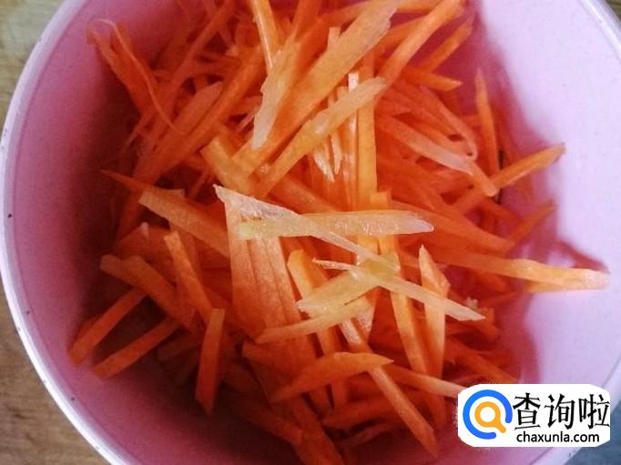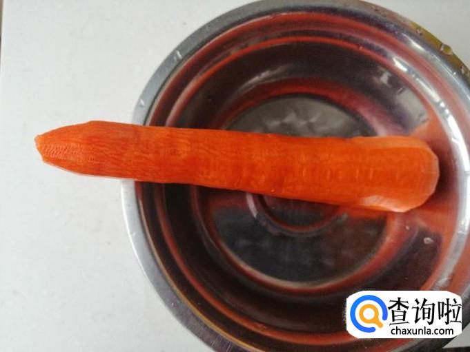 一根胡萝卜用清水洗净,用刮刀去皮切掉胡萝卜两头,切成胡萝丝待用,先把胡萝卜斜着切片,然后再切成丝。