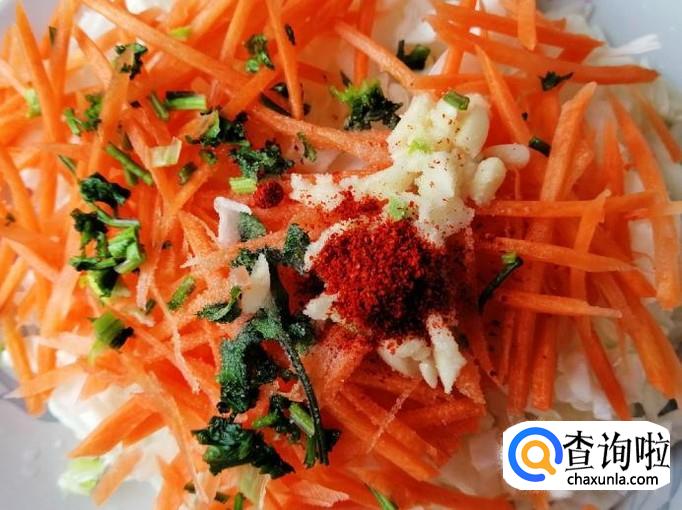 白菜心适量,胡萝卜一个,香菜少许,蒜瓣适量,辣椒面适量,食盐适量,生抽、香醋少许
