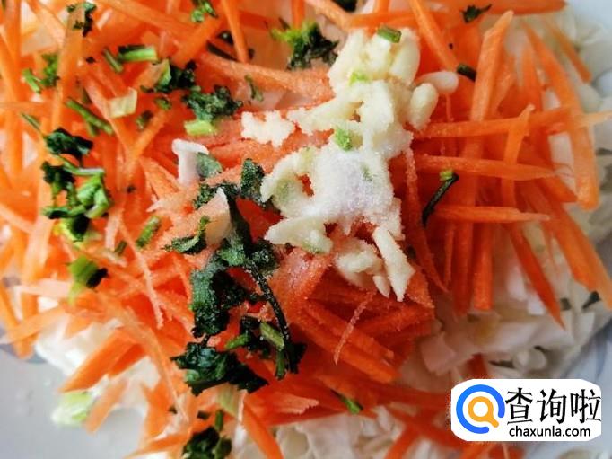 把控好水的白菜心放入盘中,加入切好的胡萝卜丝,放入备好香菜末,都放好后待用。