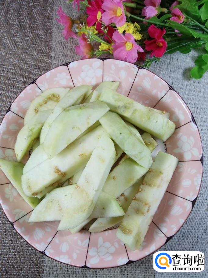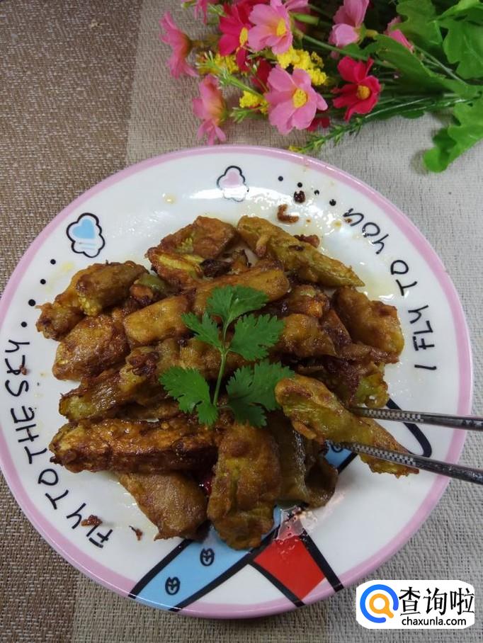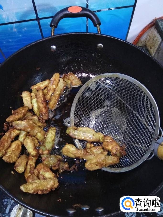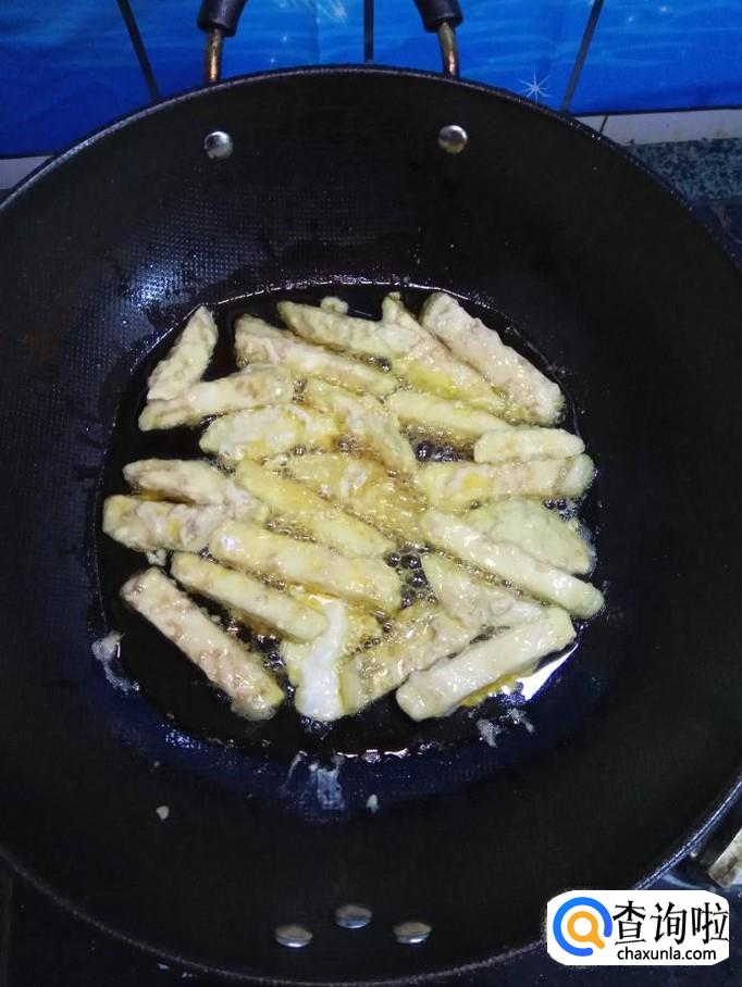 炒锅中放入适量油,油温五成热后,将茄条放入锅中,小火慢炸,注意火候,火不能大,否则容易炸焦,影响口感。