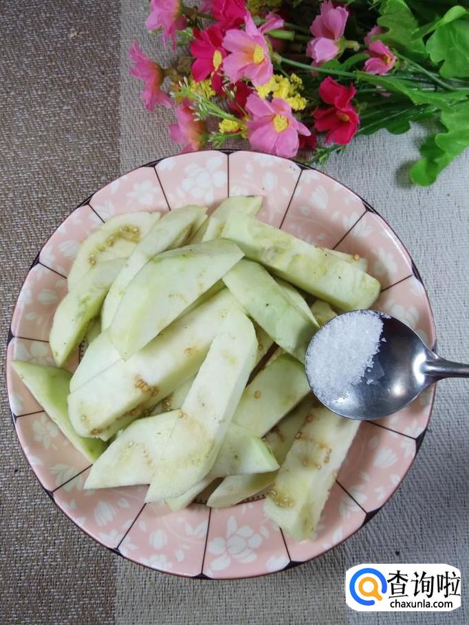 将茄子切成长条,然后加入适量食盐,腌制15分钟左右,腌出水分,稍微用手捏一下,将腌出的水分倒掉。