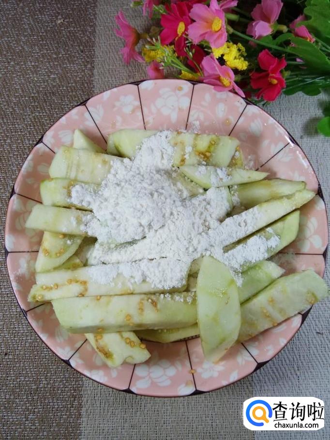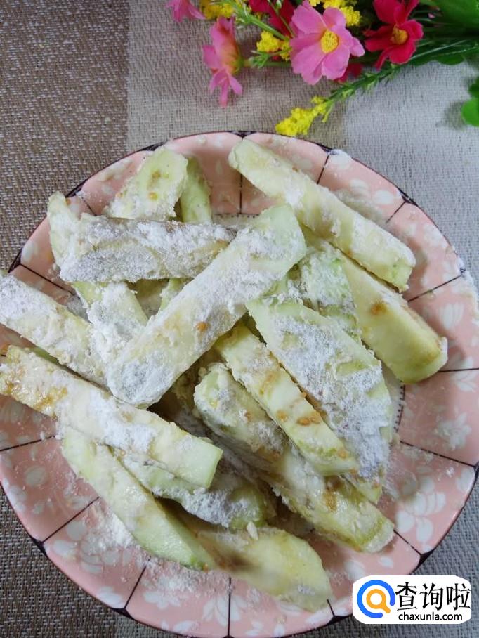 加入适量面粉,让每一根茄条上面,均匀的沾上一层面粉。