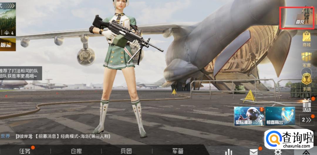 首先登陆和平精英游戏之后,在游戏界面我们可以看到首充图标。