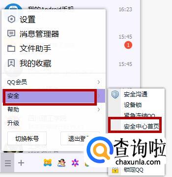 首先在电脑上登录QQ,点击左下角的最边上的‘菜单符号‘,然后选择‘安全’——‘安全中心首页’。
