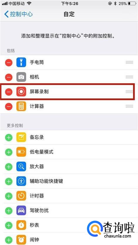 首先将屏幕录制功能添加到控制中心中,如下图所示。
