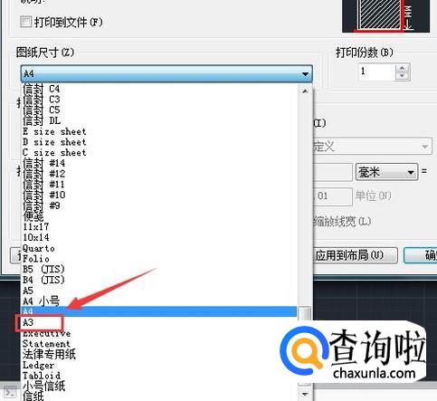 设置好打印机之后,然后在下面找到图纸尺寸选项,在这里设置我们的打印尺寸为A3,如图所示: