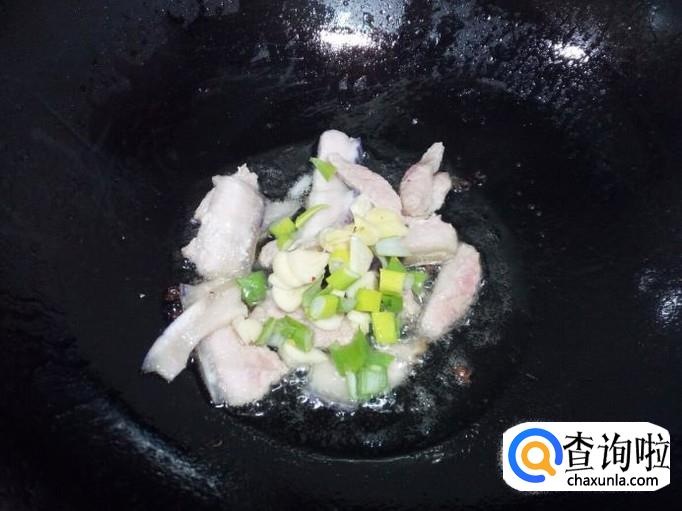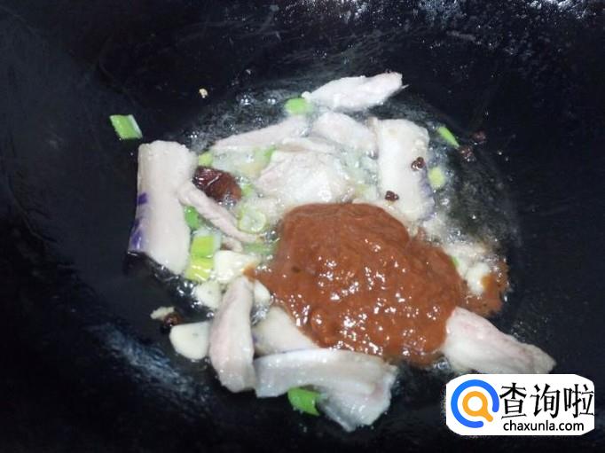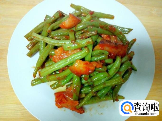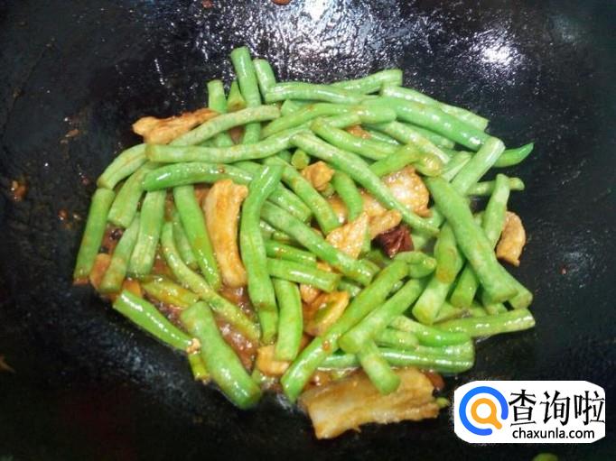 炒至肉下油,放入葱,姜,蒜翻炒。放入料酒,放入两匙儿黄豆酱,稍翻炒一下,随即放入芸豆翻炒,不用放盐。