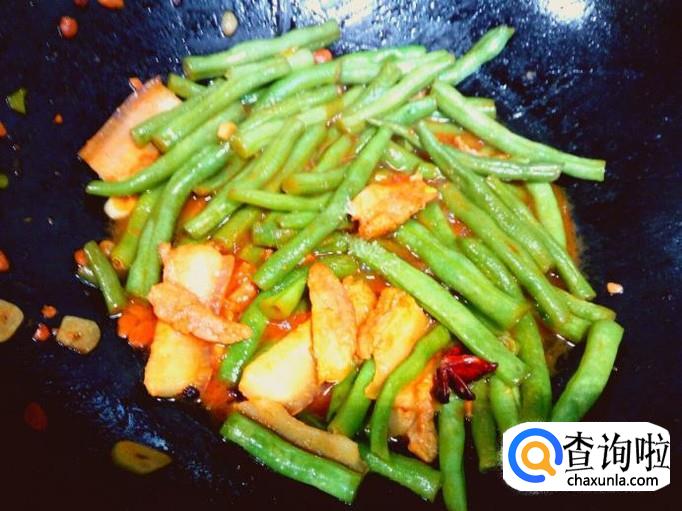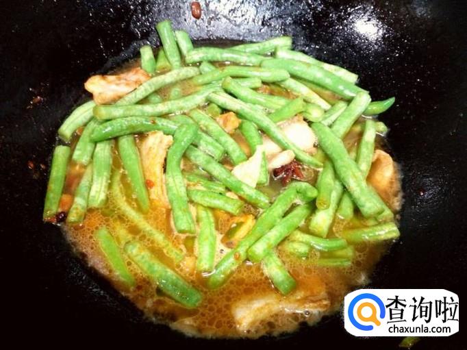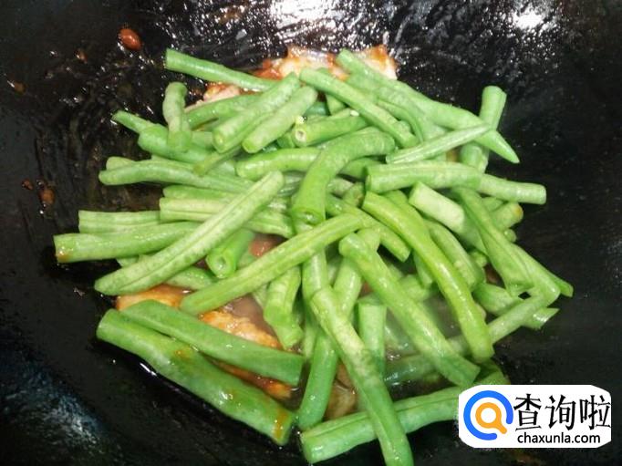 翻炒至芸豆变软,沾满酱汁,然后放入水,水和芸豆一平,大火烧开,转小火闷烧。