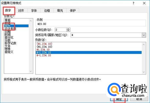 弹出的界面,我们点击数字,然后点击货币,之后我们点击确定;