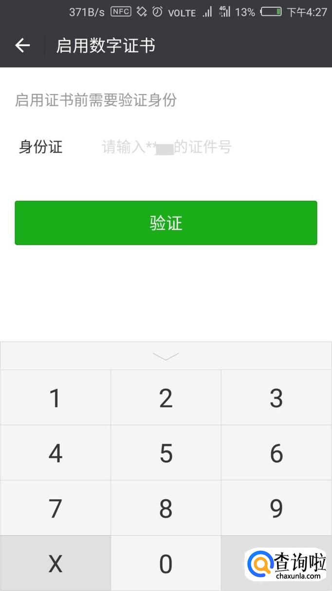 然后输入你的身份证号以验证你的身份,证明是你自己亲自开启的数字证书。