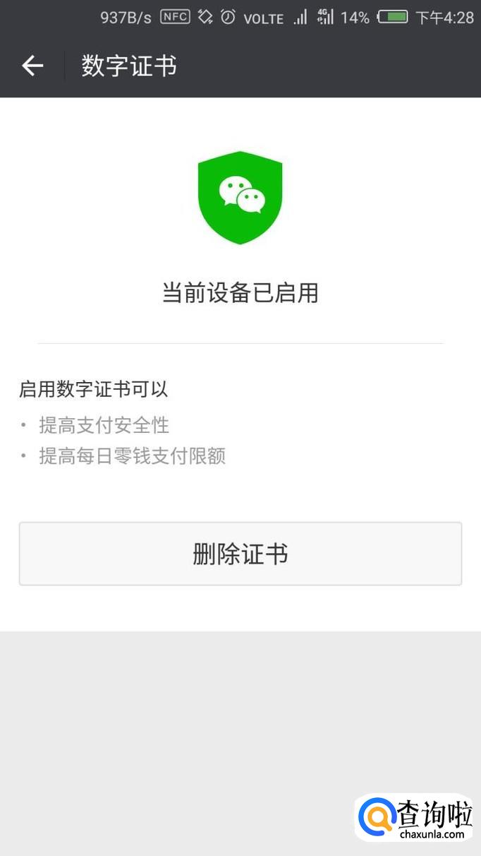 如图所示,可以发现数字证书已经启用成功了。启用成功后,你每日零钱的支付限额就提高了,支付的安全性也提高了。如果你不想开启数字证书,点击“删除证书”即可。