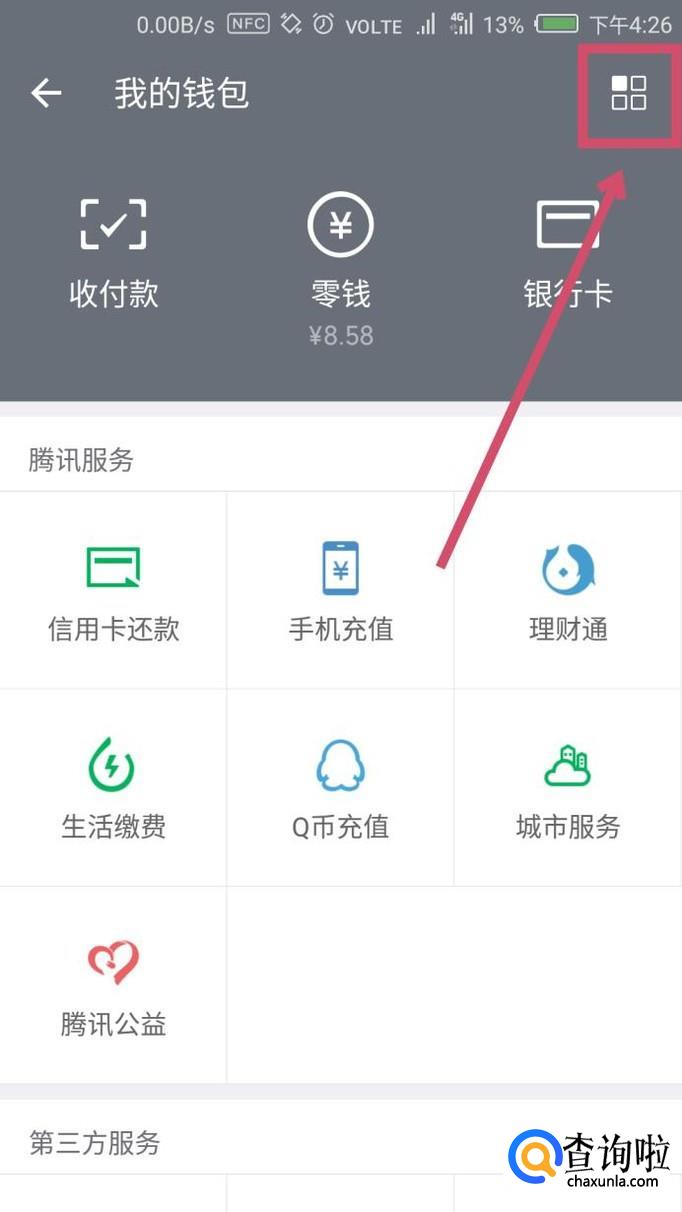 进入到“钱包”界面,在界面的右上角有一个小标志,这里是微信的“支付中心”,点击进入。