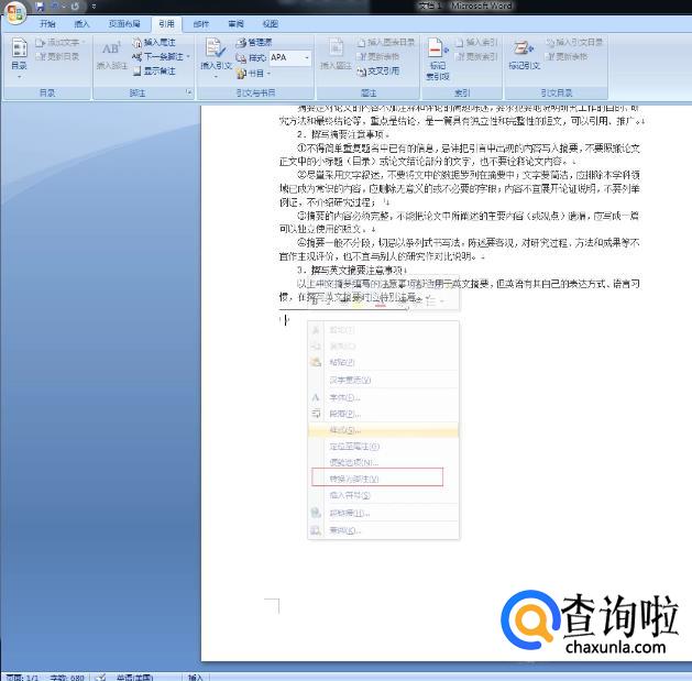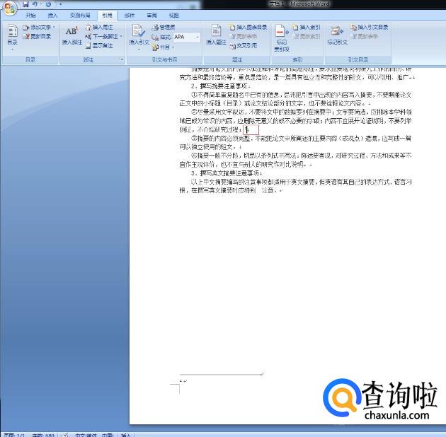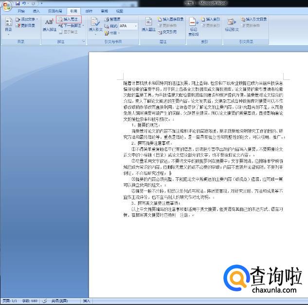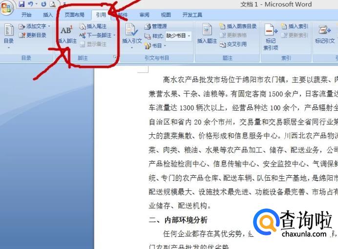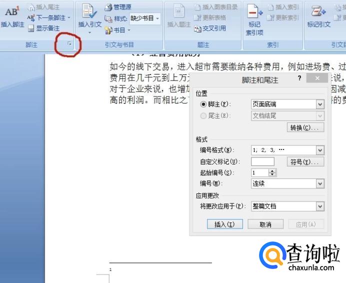先介绍一下如何添加尾注。首先,我们需要引用一个脚注。在下面框内圈出的部分选择“引用”,接着选择插入脚注。