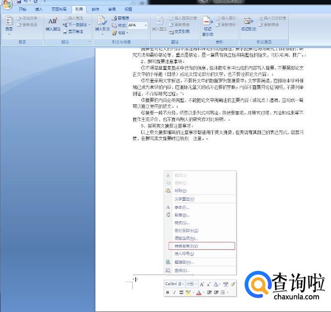 增加脚注完成后,若想将脚注转换成尾注也是可以做到的。选择脚注点击右键进行“转换至尾注”程序。