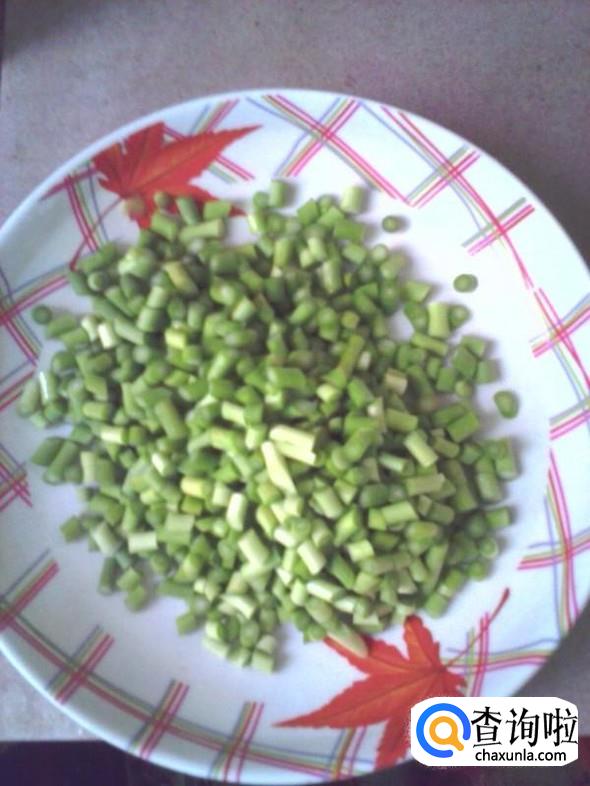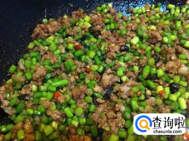 首先我们先将蒜苔、猪肉、切成块,最好切成细小的块状,然后加入豆瓣酱炒熟备用。
