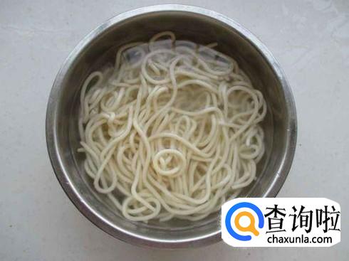 我们可以选择在超市购买比较筋道的面条,我们也可以自己赶制,自己做的面条会更加筋道些,然后把面条煮好备用。