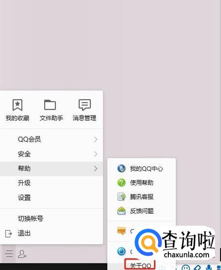 如下图,打开最新版QQ面板以后,在左下角点击横杠线图标,点击以后依次选择"帮助"-"关于QQ";
