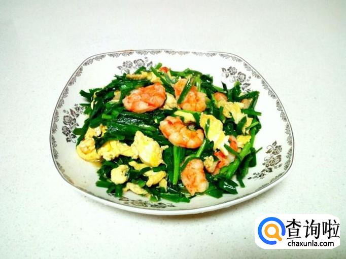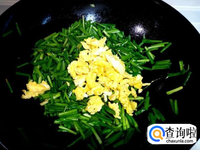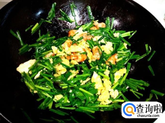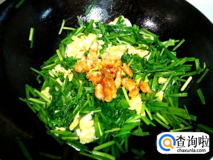 炒至韭菜刚出亮光,放入炒好的鸡蛋略翻炒一下,再放入炒好的虾仁稍翻炒即可。