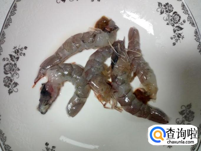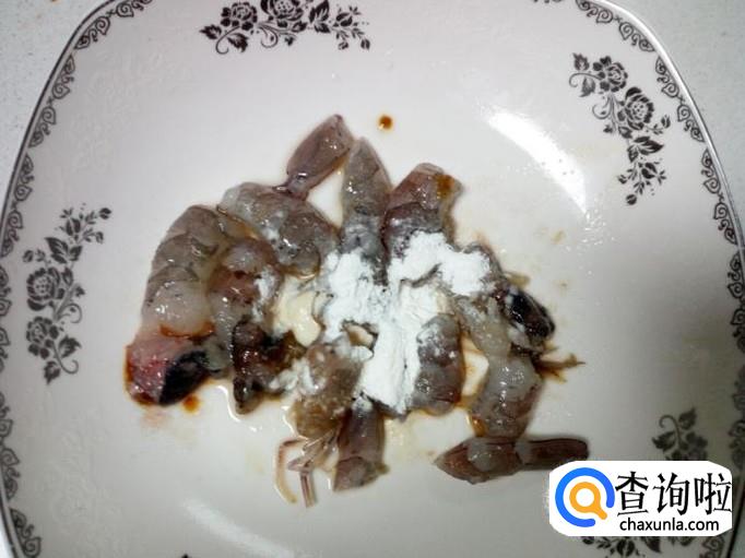 虾剥去皮,用水清洗干净,控干水分。用刀把虾仁切成段,放入少许盐,料酒,淀粉,拌和均匀,腌制15分钟。