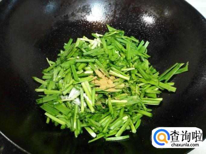锅里放入油加热,油热后,放入葱,姜,爆锅。放入韭菜,五香粉,盐,快速翻炒。