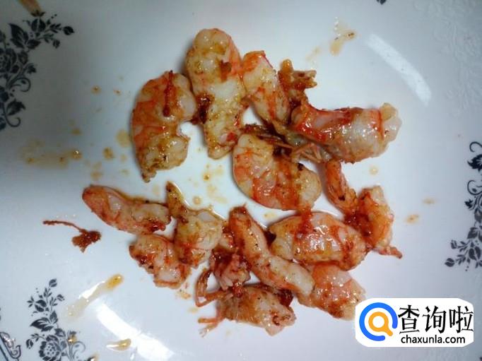 把腌制好的虾仁用锅炒熟,炒至颜色变红,盛出备用。