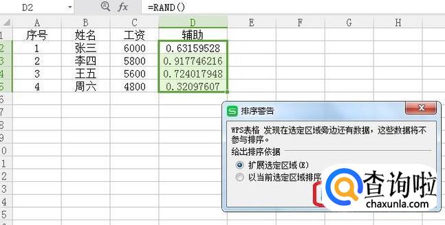 我们可以做一个辅助列。如图所示,在D列中的D2单元格输入函数:=rand(),然后按回车键。